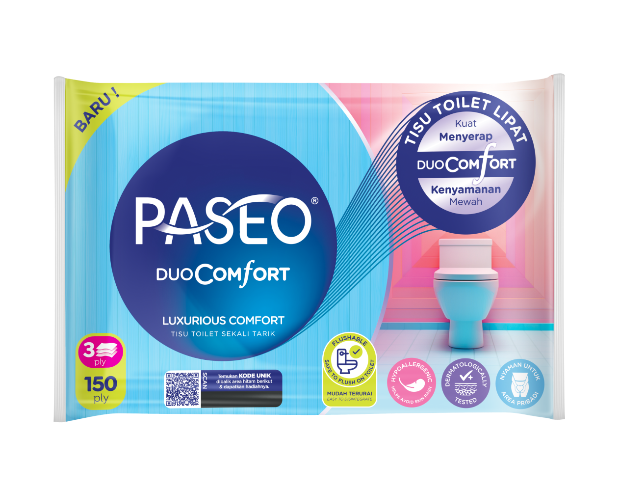 Paseo introduces a new innovation as the first in Indonesia: foldable toilet tissue in packaging, providing the best experience for using toilet tissue anywhere. This product offers two conveniences at once: waterproof packaging and softness with every touch. Made from 100% natural fibers that are clinically tested to be safe for the skin, this tissue is free from harmful chemicals and certified halal, ensuring that each 3-ply sheet remains safe with perfect absorbency.